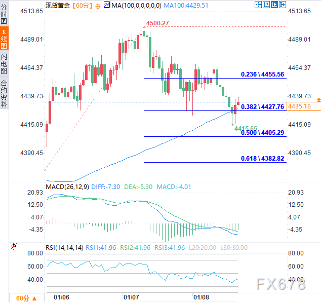 从技术面看,由100小时简单移动平均线(SMA,4429.50)和近期上涨波段38.2%斐波那契回撤位4428组成的共振支撑区域,可能为金价提供一定支撑。若该位置被有效跌破,可能引发技术性抛售,并将金价拖至4400美元关口。
