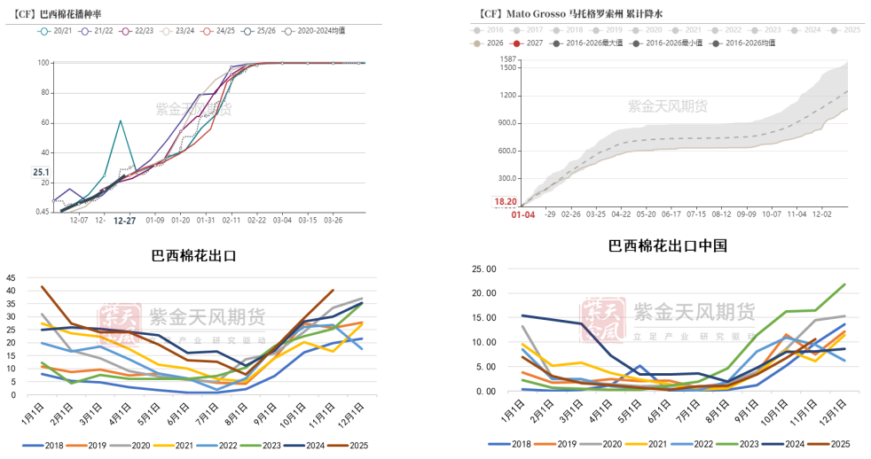 11月份原棉出口量为40.2万吨。当前依然为巴西棉出口旺盛的窗口期,直到2026年3月后回落。
