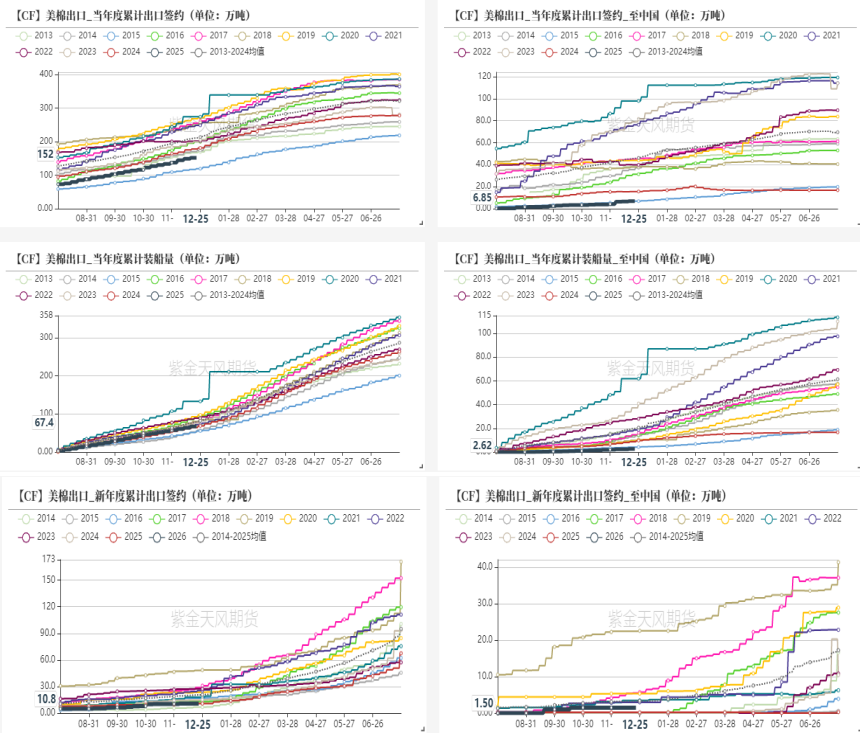 新年度种植预期:中性偏多 12月报告中,2025/26年度全球棉花供需平衡表显示,全球棉花产量、消费量及贸易量均小幅下降,期末库存则有所增加,影响中性偏空。美棉产量小幅调整,影响中性。但是美棉新季种植意向可能下调。