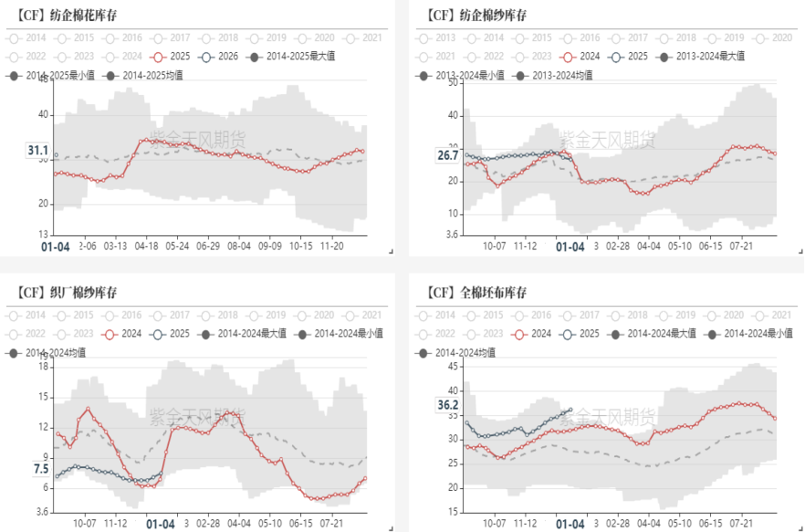 截至1月4日,纺纱厂原料库存为31.1天,成品库存26.7天,呈现去库。织布厂棉纱库存为7.5天,原料启动补库,织布厂全棉坯布成品库存36.2天,小幅累库。