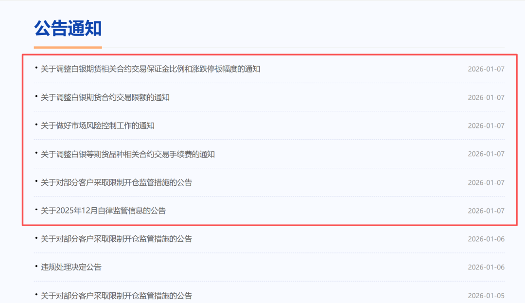 1月7日,上海期货交易所官网连发6条公告,强化市场监管。6条公告涵盖白银期货相关合约交易保证金比例和涨跌停板幅度调整、交易限额调整、风险控制、交易手续费调整、自律监管等多个维度,打出监管组合拳,以应对近期金属品种价格波动,规范市场交易秩序。
