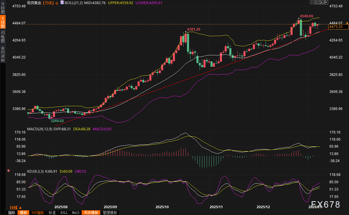 汇通财经APP讯——周四(1月8日),现货黄金在经历早盘下探后强劲反弹,最终收于每盎司4477.28美元附近,涨幅约0.5%。盘中一度触及4407.73美元的日内低点,这反映出市场在高位震荡中的谨慎情绪。尽管金价已站稳在4400美元上方,但短期内仍面临一定压力,主要来自于彭博商品指数的年度权重调整。这一调整机制旨在使指数更贴合市场现实,但在本周启动后,对黄金、白银等贵金属形成了明显的抛售压力。市场策略师指出,这种指数再平衡往往会引发基金被动卖出,导致金价短期承压,但这更多是技术性因素,而非基本面恶化。周五(1月9日)亚市早盘,现货黄金高位震荡,目前交投于4476.51美元/盎司。