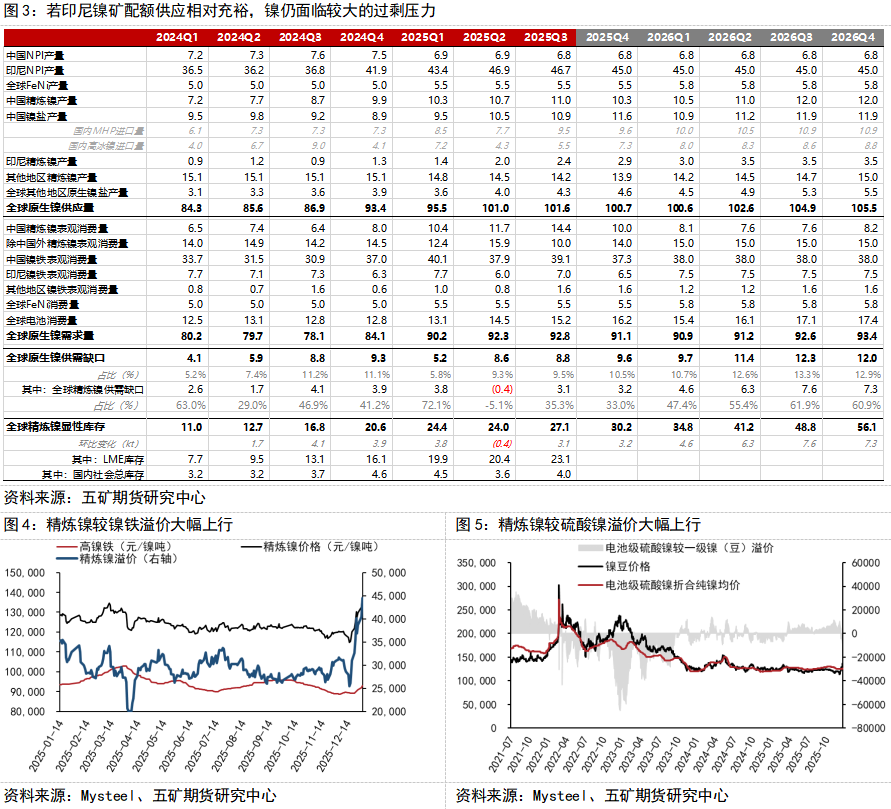 从供需来看,2026年若印尼镍矿配额供应相对充裕,镍仍面临较大的过剩压力。我们在年报中提出,2026年,随着印尼部分项目的投产,镍元素过剩依旧明显,镍铁与精炼镍价格将显著承压。对于镍铁而言,火法矿刚性成本支撑下,预计价格会阶段性跌破部分企业现金成本,倒逼企业减停产,实现供需的再平衡。对于精炼镍而言,存在估值锚切换的可能性,表现或弱于镍铁价格。