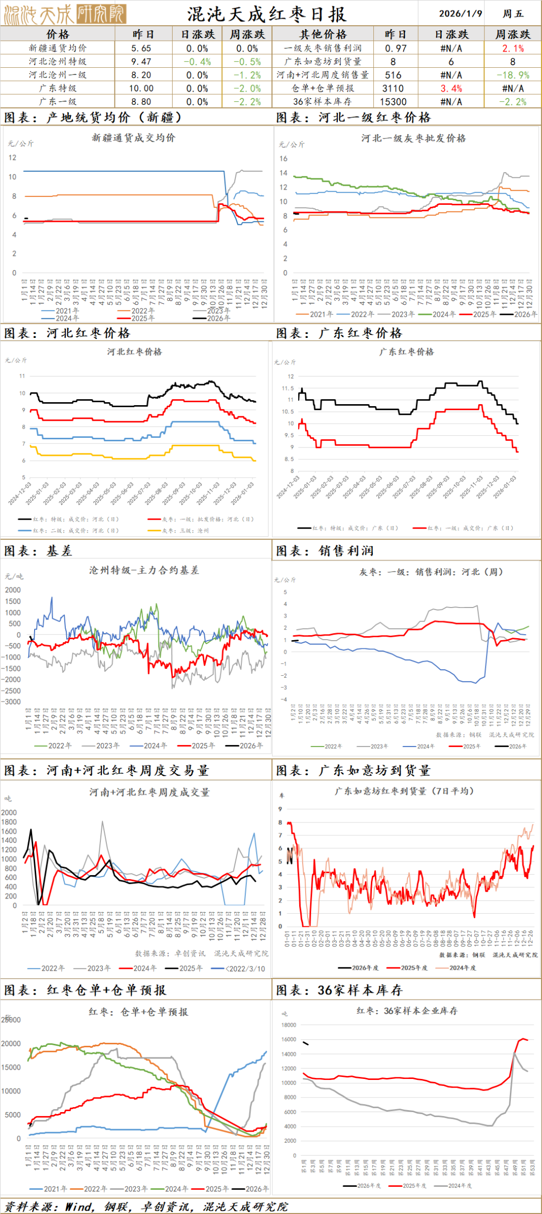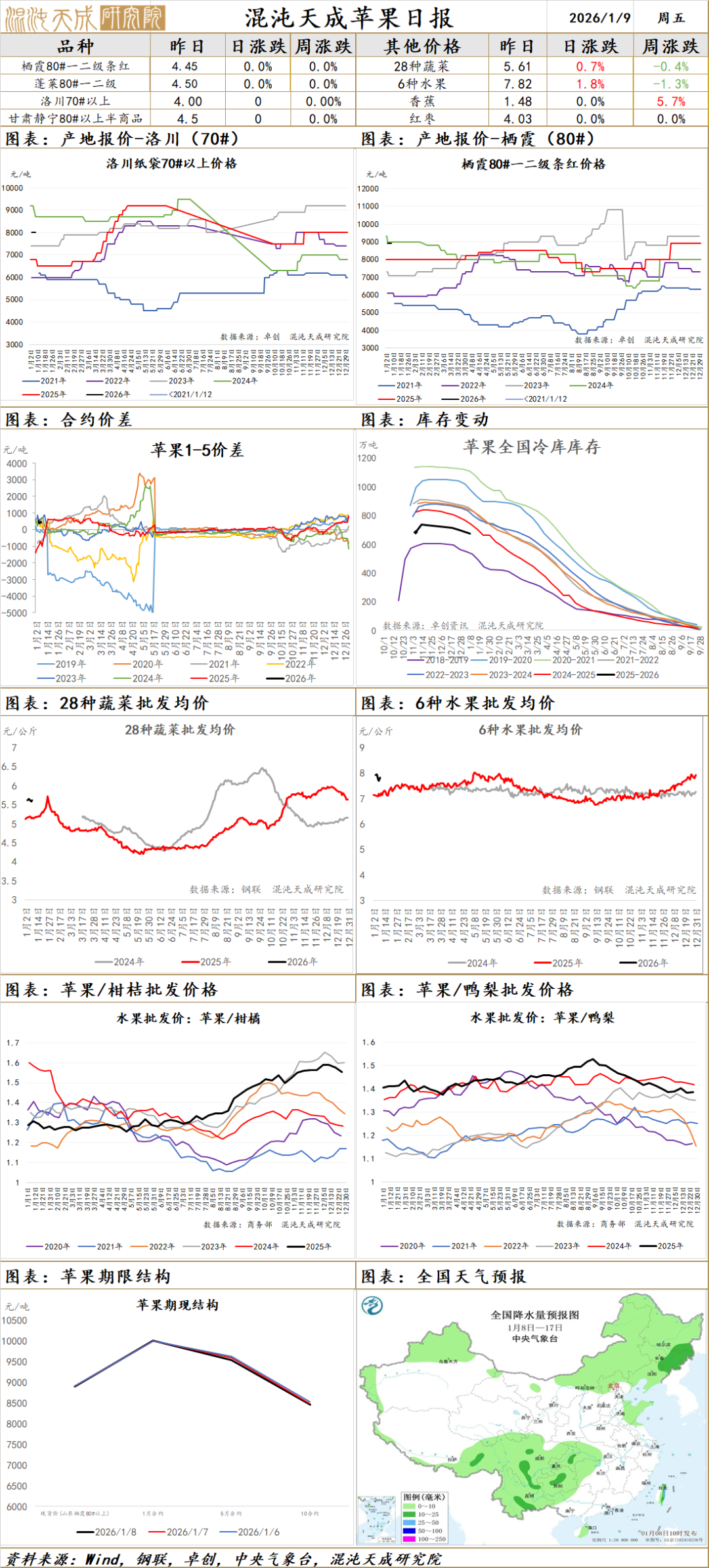 苹果:钢联数据:截至2026年1月7日,全国主产区苹果冷库库存量为720.90万吨,环比上周减少12.66万吨,去库速度环比略有增快,同比仍低于去年同期;卓创数据:近2周出库28.7万吨,去年同期2周出库47万吨;山东产区库存苹果晚熟纸袋富士主流价格稳定,春节备货开始,客户采购量增加,整体出货稍有提高,一二级成交不多,一二三级及三级果、次果成交;陕西产区主流价格稳定,客商主要选购好货及低价货,好货难寻,包装自有货源的比较多,果农中等货出残偏高,性价比较低,客商采购意愿不强;市场近两日到货稍有减少,出货平稳,价格维持稳定;消费端表现偏弱,柑橘等水果大量上市,对苹果现货造成一定冲击,交割博弈再次发酵,维持高位震荡,近期主要关注春节备货消费端表现。