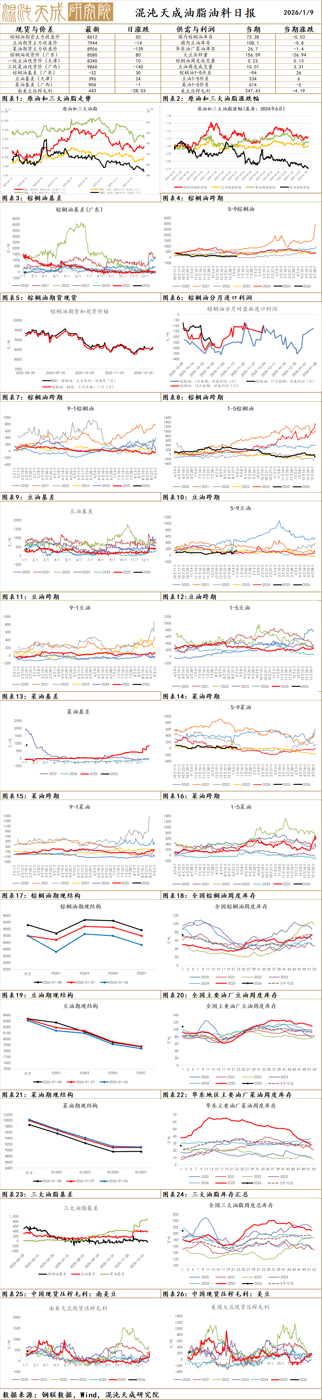 需求端:1月8日(周四),印尼能源部公布的数据显示,该国去年消费1,420万升棕榈基生物柴油,较上年增长7.6%,因该国实施B40生物柴油掺混要求,即B40,B50生物柴油路测已于12月启动,计划今年下半年实施;受冬季需求疲软以及加工厂增加对豆油和葵花油等竞品的购买影响,印度12月棕榈油进口量降至八个月低点;印尼生物柴油生产商组织APROBI的秘书长Ernest Gunawan表示,印尼2026年生物燃料产量配额设定在1,564.6万千升,印尼2025年生物燃料配额为1.560万公升,这个东南亚国家已强制要求柴油中棕榈油掺混比例达到40%,并计划从明年起将这一比例提升至50%,以此减少对进口化石燃料的依赖;特朗普政府预计不会在今年年底前确定2026年生物燃料掺混配额,美国生柴政策继续面临不确定性;印度11月植物油进口量为1183832吨,而10月为1332173吨,印度11月棕榈油进口量为632341吨,高于10月的602381吨;德国立法将禁止使用以棕榈副产品为原料的生物燃料的禁令推迟至2027年实施,提振棕榈油未来需求预期;欧洲议会支持将《欧盟零毁林法案》实施推迟一年;印尼能源部官员表示,截至11月10日,该国今年生物柴油消费量已达1225万千升,这些生物柴油采用棕榈油制成的脂肪酸甲酯(FAME)为原料,印尼政府已为2025年生物柴油消费分配了1560万千升的FAME用量;马来年底前启动可持续航空燃料生产、国内消费预期增加;据巴西国家能源政策委员会(CNPE)官员,巴西将生物柴油在柴油中的强制掺混比例从14%上调至15%;昨日新增买船0条,本周累计买船3条,上周国内棕榈油库存环比持平。