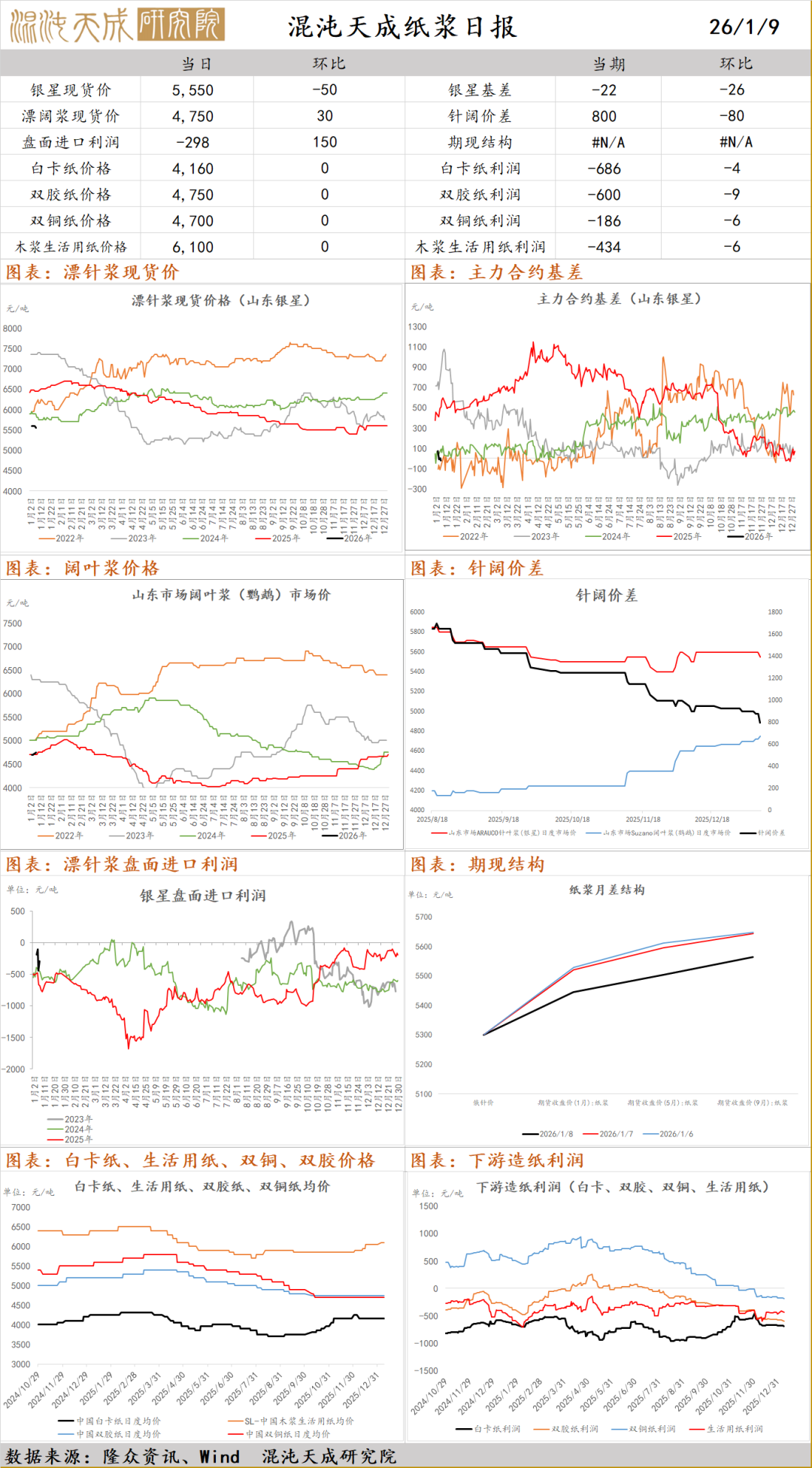 纸浆:亚太森博表示,1月阔叶浆接单价格上调150元/吨;昨日国内针叶浆现货小幅下跌,银星5500元/吨(-50),俄针5300元/吨(-100);阔叶浆现货小幅上涨,金鱼4750元/吨(+30);针阔叶浆价差800元/吨(-80),纸浆市场整体呈现交投清淡、价格持稳;白卡纸市场行情主流延续稳定局面,局部市场有喊涨100元/吨至4210元/吨;生活用纸市场价格区间盘整,市场整体交投积极性一般;文化用纸市场文化用纸市场观望整理,交投气氛不旺;本周国内纸浆主流港口样本库存量为200.7万吨,较上期累库1.0万吨,环比上涨0.5%;本周下游开工,白卡纸环比+3.5%,双胶纸环比+0.2%,铜版纸环比+11.1%,生活用纸环比+0.3%;盘面高位震荡,近年针叶浆整体产能扩张有限,持续低价导致上游高成本浆厂出现停产、关闭产能等情况,下成本支撑明显,同时交割品取消部分俄针品牌,对远月估值也有利多,国内纸厂整体维持刚需购买,在国内春节旺季结束前,可以考虑回调逢低买入。