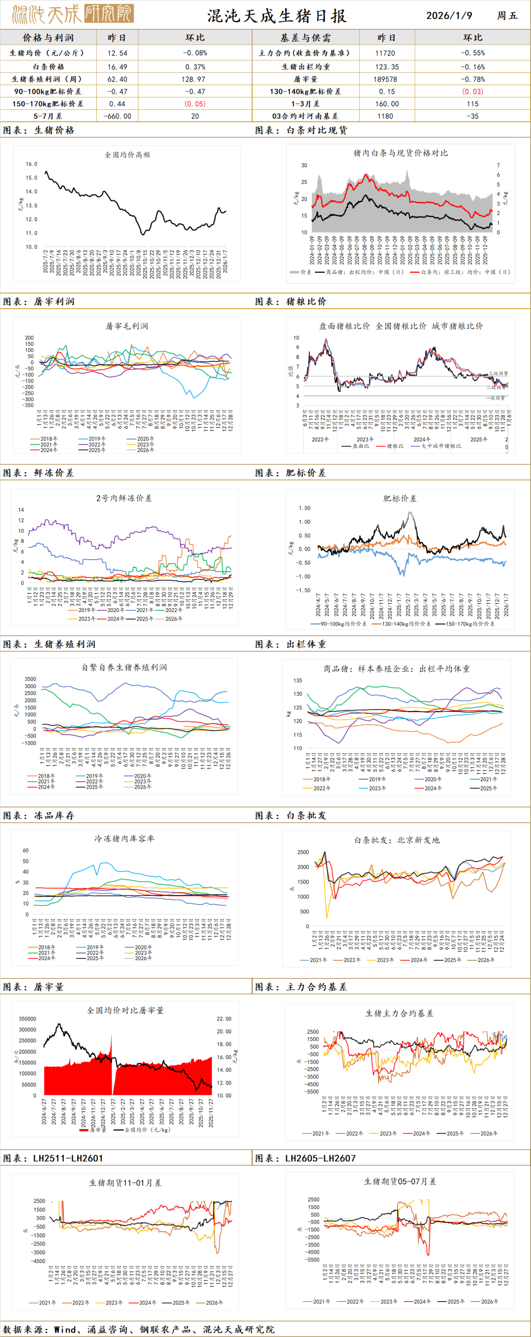4.政策消息:关于2026年1月12日中央储备冻猪轮换出库竞价交易有关事项的通知:本次出库竞价交易挂牌国产冻猪肉17,000吨,具体数量以实际挂牌为准。交易时间。2026年1月12日8:30-16:30.如有变化,另行通知。(华储网)