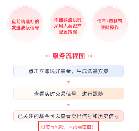 AI选好基金能根据当天的市场行情判断是否适合通过低买高卖来赚取波段收益,若适合,则会挑选具有波段潜力的基金给您,并为您及时发送信号,您可以跟随信号进行操作。若不适合,AI选好基金将为您推荐大类资产配置策略,该策略会在全球资产中选取当前更具投资价值的大类资产,同时给出供参考的配置比例并及时动态调整,来平衡整体投资的收益和风险,增加整体投资回报。