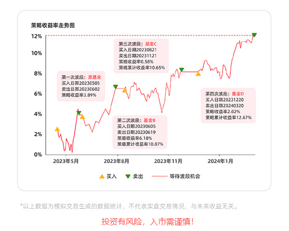 以某核心主题混合基金为例,客户在2023年5月5日开启波段策略,第一次波段为原基金,后三次波段为具有波段潜力的其他基金,分散投资有利于降低单一资产带来的风险。在经历4次波段后客户最终在2024年3月20日将基金卖出,策略累计收益率12.67%。