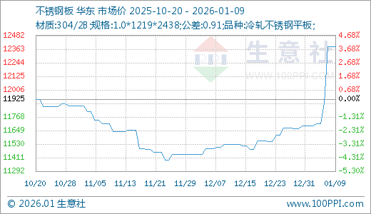 据生意社价格监测,本周不锈钢价格小幅上涨。截止1月9日,现货304/2B不锈钢平板1.0*1219*2438(公差0.91)的日均价为现报价12383.33元/吨,较周初上涨5.77%,同比上涨3.56%。