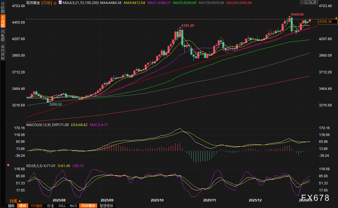 汇通财经APP讯——在2026年的第一个完整交易周,现货黄金价格再度上演惊心动魄的上涨行情,周涨幅接近4%,上周五(1月9日)收盘报4509.36美元/盎司,盘中最高一度触及4516.91美元,距离去年12月底创下的历史峰值4549.71美元已经非常接近,美国就业数据欠佳和地缘政治局势动荡,给金价提供了上涨动能。整个市场弥漫着一种难以抑制的兴奋情绪——黄金似乎正在为冲击5000美元大关积蓄最后的力量。