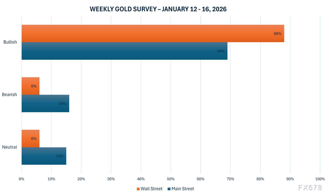 上周五华尔街主流机构在Kitco黄金调查中呈现一边倒看涨格局,88%的专业人士认为本周金价还将继续上涨。零售投资者同样保持高度乐观,近七成看好后市。