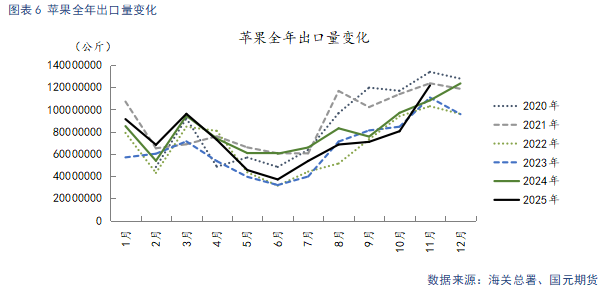 据海关总署数据显示,截至2025年11月,我国苹果当月出口量为12.16万吨,较9月环比增加50%,较去年同期增加12.38%。我国苹果出口的传统旺季集中在每年四季度至次年一季度。10月新季晚熟下树后,商品率偏低,国内市场的好货偏紧,而适合出口的中小果货源供应较为充足。四季度是传统出口旺季,预计在圣诞、公历新年的节日氛围下,海外需求增量预期,出口延续环比增长势头。