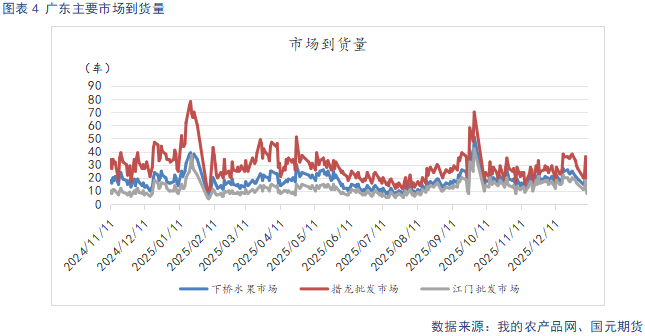据钢联数据统计,截至1月8日,洛川70#以上半商品均价4.2元/斤,较上周环比持平;栖霞纸袋80#一二级均价4.1元/斤,较上周环比上涨持平。截至1月8日,广东主要批发市场日均到货量为11.7车,较上周环比下降7.6车。元旦假期结束后,销区有一定备货库存累积,下游采购积极性不强,市场到车量较节前下降,价格相对平稳。