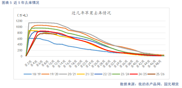 据我的农产品网统计,2025年国内苹果产量为3431.42万吨,较去年下降6.01%。产量数据与此前市场预期基本吻合,下降程度相对有限。截止1月7日,全国主产区苹果冷库库存为720.9万吨,较上周减少12.66万吨。剩余库存处于历史偏低水平,且库存商品率偏低,呈现量质双低局面。当前出库较前期有所提速,但仍低于去年同期。主要在于年关偏晚,春节备货还未集中开启,仅有部分礼盒备货,下游拿货意愿不强,以消化自有库存或选购好货为主。