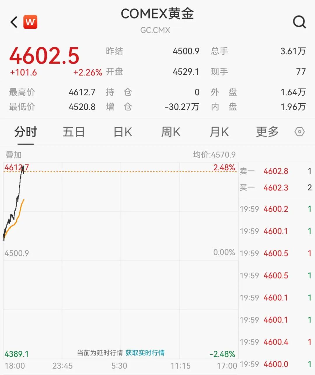 纽约期金突破4610美元/盎司,截至发稿报4602.5美元/盎司,日内涨2.26%。