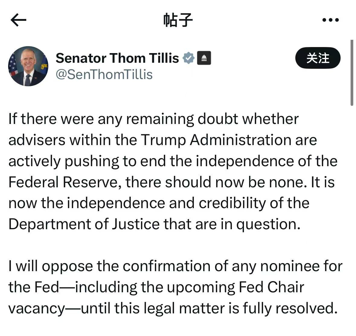 1月12日,针对美联储主席鲍威尔被刑事调查,美国参议员Thom Tillis在社交平台X上发帖称,如果之前还有人怀疑美国总统特朗普政府内部顾问是否正在积极推动终结美联储的独立性,那么现在应该完全消除这种疑虑了。现在真正受到质疑的是司法部的独立性和公信力。