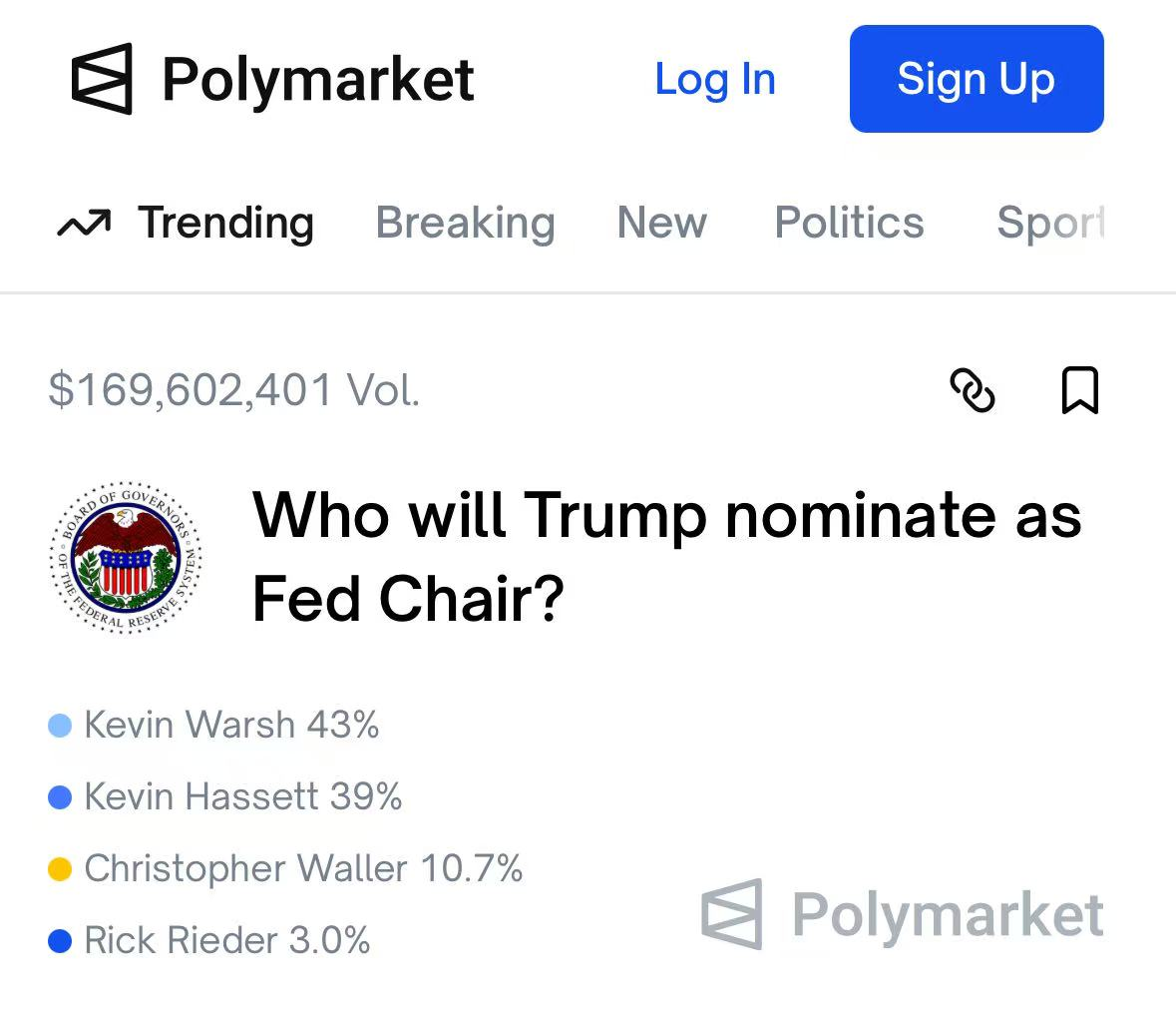 据市场预测平台Polymarket数据,截至1月9日,美联储理事沃什以43%的当选概率成为下一任美联储主席的最热门人选,超越白宫经济顾问哈塞特的39%。此前,市场概率显示哈塞特领跑。此外,美联储理事沃勒有10.7%的概率当选。而贝莱德(BlackRock Inc.)全球固定收益首席投资官里德当选概率仅为3%。