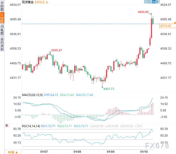 周一亚市时段,现货黄金震荡上行,延续前两个交易日涨势,日内涨幅约1.35%,一度触及4600.89美元/盎司的历史新高,而后遭遇逢高抛盘压力小幅回落,现交投于每盎司4570美元附近。