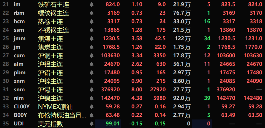 黑色系均飘红,铁矿涨1.1%,螺纹涨0.73%,热卷涨0.73%,不锈钢涨1.28%。双焦方面:焦煤主力合约涨3.58%,焦炭主力合约涨1.26%。