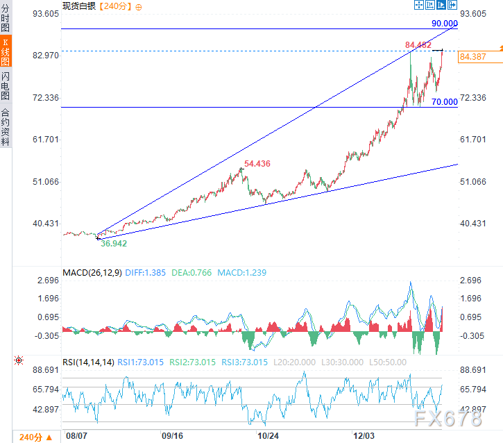 另一方面,白银价格也受到相同组合的宏观风险和鸽派预期的支撑。然而,白银确实存在工业需求,这为其提供了另一层支撑。近期的回调幅度较浅,表明看涨兴趣仍在持续。随着黄金创下新高,白银价格也创下每盎司83.97美元的新高,如今看来,100美元左右的心理目标可能已不再遥远。周一亚市时段,白银震荡上行,日内涨幅约4.6%。