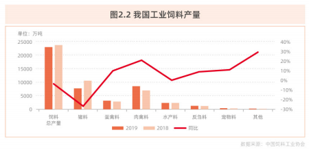2011年至2019年我国生猪工业饲料产量由6830万吨增加至7663万吨。2019年非洲猪瘟影响,生猪存栏大幅下降导致猪料消费近年来首次下降,猪料产量同比下降26.6%,生猪工业饲料产量占比由2018年的44%下滑至2019年的33%。