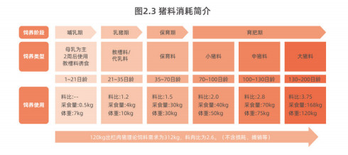 商品猪从出生到出栏相继经历哺乳仔猪、断奶仔猪、保育猪、育肥猪等四个阶段, 分别对应哺乳期、乳猪期、保育期、育肥期四个饲养环节。120千克出栏肉猪理论饲养日龄200天,总耗料312千克,料肉比为2.6。