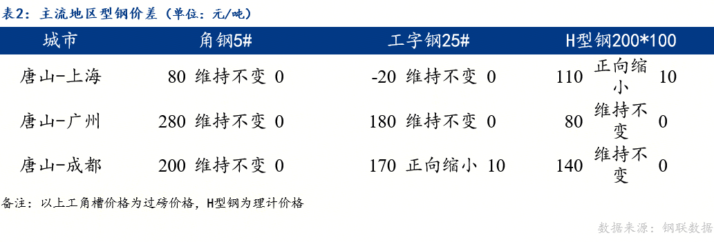 今日地区型钢价差基本不变,唐山与上海H型钢价差正向缩小,唐山与成都工字钢价差正向缩小。