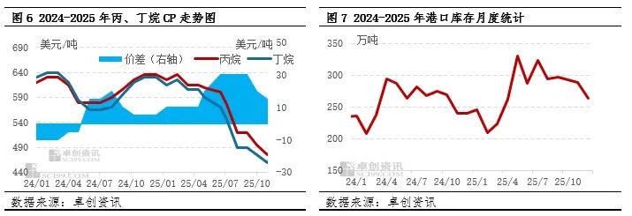沙特阿美公司11月CP公布,丙、丁烷均较10月下调。丙烷为475美元/吨,较上月跌20美元/吨,丁烷为460美元/吨,较上月跌15美元/吨。丙烷折合到岸成本预估在4338元/吨左右,丁烷折合到岸成本预估在4221元/吨左右。CP公布价格较预期偏高,同时贴水价格较高,倒是进口成本增加明显,对业者采购热情形成明显抑制。市场采购力度下降,多刚需采购为主,企业消耗库存,进口到港量下滑的情况下,港口库存也出现明显下调。