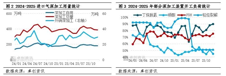 根据卓创资讯数据统计,2025年11月丁烷脱氢装置开工负荷上涨1.89个百分点,顺酐装置开工负荷下降6.37个百分点,PDH装置开工负荷上涨3.59个百分点,轻烃裂解开工负荷较上月持平。进口气深加工总需求量209.45