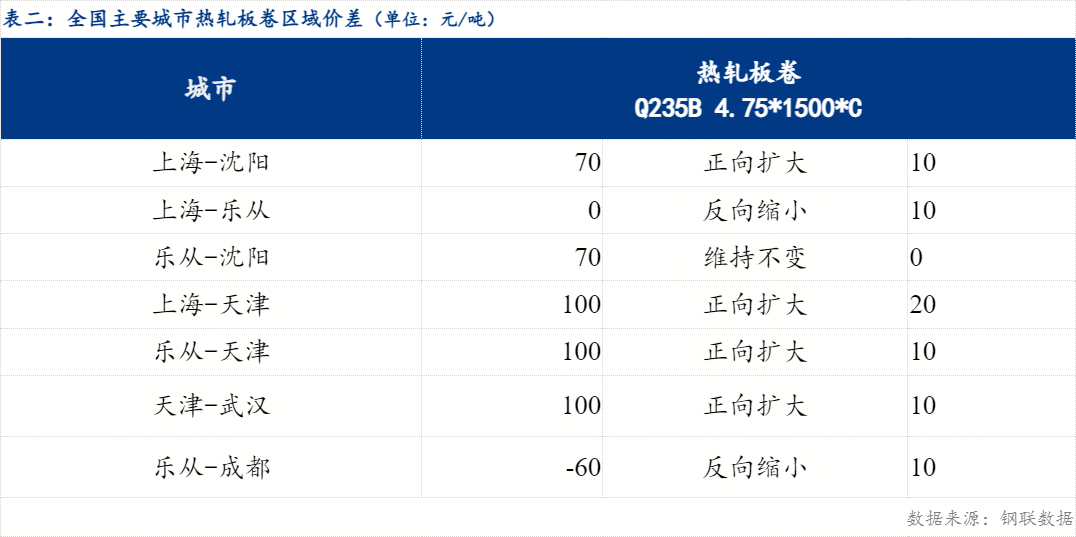 从区域价差来看,华东与东北价差70元/吨,较上一交易日正向扩大10元/吨;华东与华南价差0元/吨,较上一交易日反向缩小10元/吨;华南与华北价差为100元/吨,较上一交易日正向扩大10元/吨 。