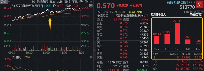 港股方面,港股AI全线爆发,港股AI核心工具——港股互联网ETF(513770)场内价格大涨5.36%。