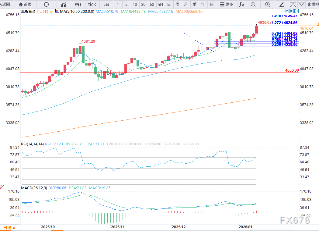 上行方面没有明显的阻力位,这自然使得下一个整数关口目标4600美元和4700美元进入视野。同时也值得关注斐波那契扩展位4625美元、4687美元和4720美元,这些区域可能会吸引关注斐波那契的交易者进行获利了结。