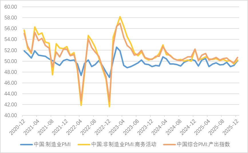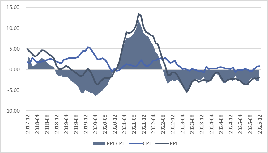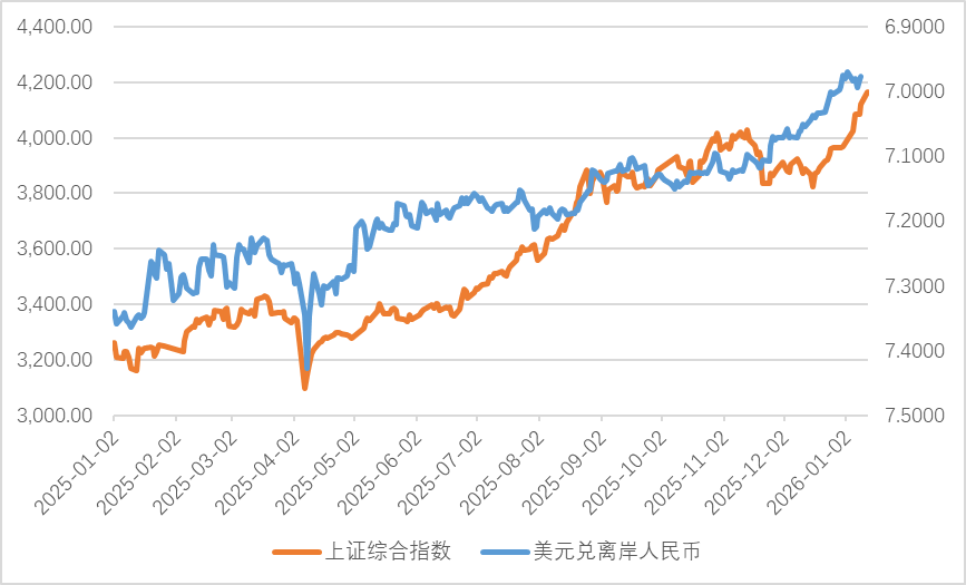 由于股市与汇市长期的正相关性,使得两者短期走势的背离最终都将出现其中一方向另一方收敛。从国家统计局公布的12月PMI,我国12月三大PMI指数均回到扩张区间,制造业PMI终结连续8个月的收缩态势。物价方面,12月份国内CPI、PPI均走高,CPI同比涨幅扩大,环比由降转涨,PPI同比降幅收窄,物价在反内卷以及扩内需政策下呈现明显修复。在通胀回升与景气回暖的背景下,股市开始逐步向汇市收敛。