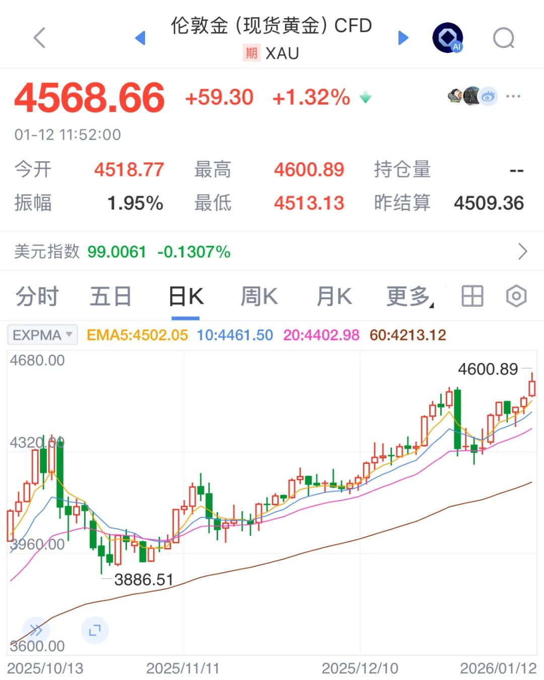 自2026年1月1日起,现货黄金一路冲高,在迅速冲破4400美元、4500美元、4550美元三个关口后,1月12日向上突破4600美元/盎司,再创历史新高。