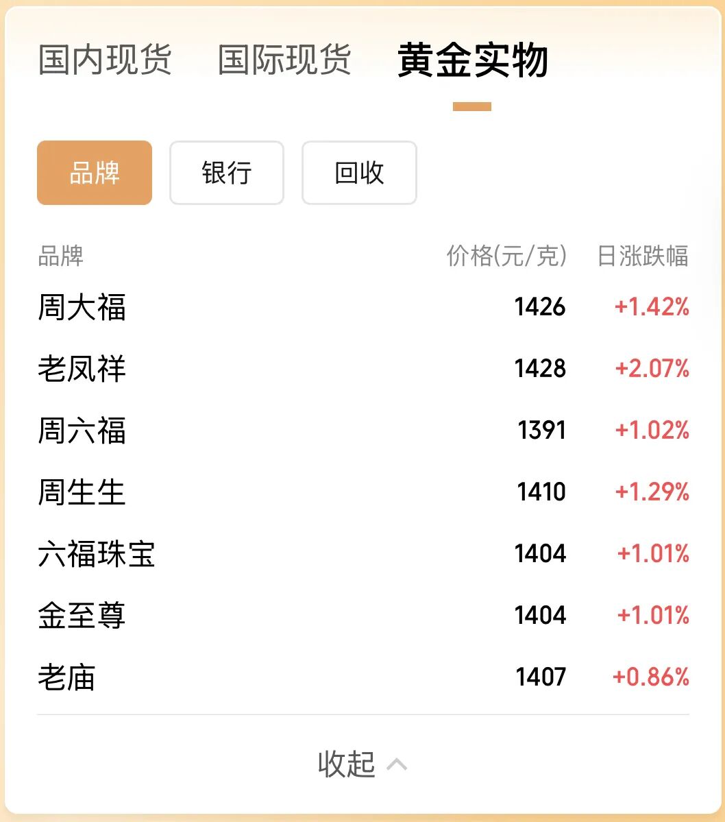 伴随着金价大涨,国内各大黄金珠宝品牌的足金金饰价格也水涨船高。刚刚,每满记者查询最新数据看到,周大福今日足金金饰克价为1426元/克,老凤祥为1428元/克,大部分品牌今日提价幅度逾1%。