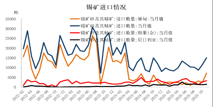 缅甸地区锡矿复产继续推进,普遍预计后续供应量将明显提升。不过当前云南等地主产地锡矿供应依旧维持紧张局面,多数冶炼企业生产较为平稳,据Mysteel数据2025年12月国内精锡产量15895吨,同比减少0.7%,2026年1月份预计产量14000吨左右,同比减少约5.3%,主要因部分炼厂存在检修。