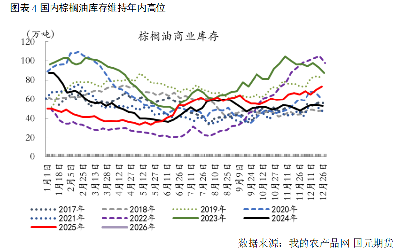 据Mysteel调研显示,截至2026年1月2日(第1周),全国重点地区棕榈油商业库存73.38万吨,环比上周减少0.03万吨,减幅0.04%;同比去年50.17万吨增加23.21万吨,增幅46.26%。
