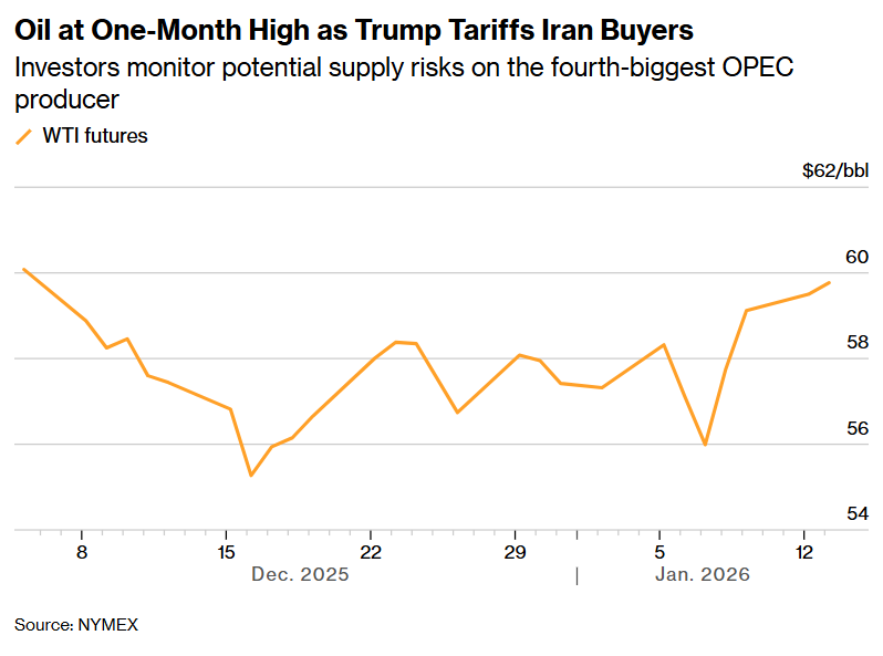 在此前三个交易日累计大涨逾6%后,西得克萨斯中质原油(即北美原油定价基准——WTI原油价格)攀升至接近每桶60美元,而布伦特周一收于64美元下方。特朗普在社交媒体上表示,针对任何“伊朗买家们”的新关税将“立即生效”,但未说明关税层面的收费范围或实施细节。