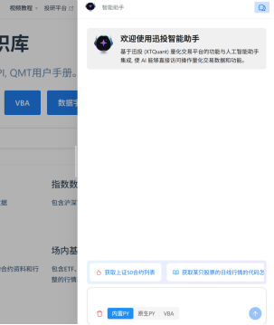 界面显示,它是一个类似智能客服的 AI 工具,能针对 QMT API 的使用直接给出建议,让你无需再费心翻阅每个 API 文档。迅投智能助手专为量化投资设计,只要你有代码方面的疑问,就能随时问它。举个例子: