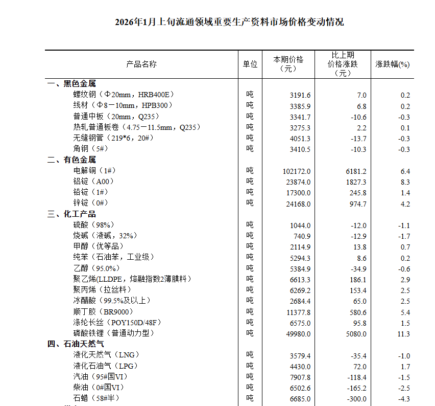 2026年1月上旬27种产品价格环比上涨,磷酸铁锂涨11.3%、电解铜涨6.4%