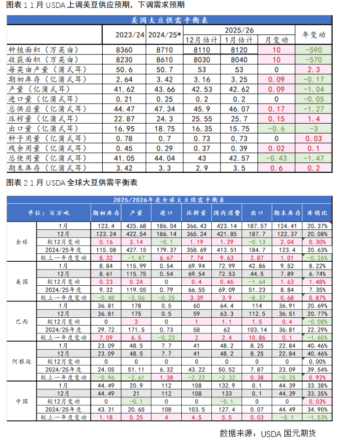 2026年1月13日凌晨,USDA发布1月大豆供需平衡报告。1月USDA供需平衡报告是年度大豆供需预测的关键节点,首次公布基于农户调查的美国年度作物最终产量数据,本次报告上调美豆供应预期,下调需求预期。另外,10月底后,中美大豆贸易由停滞开始向常态化进展,但实际贸易情况仍限制美豆出口销售预期,本文将分析USDA报告的的影响,以及中美大豆贸易进展、美豆和豆粕的行情展望。