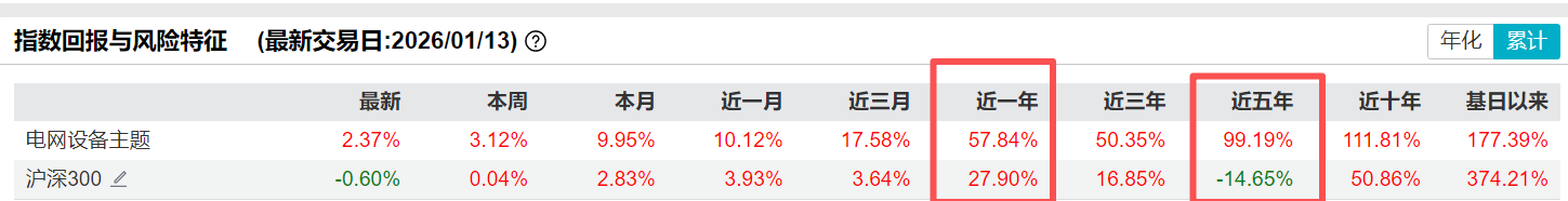 天弘中证电网设备主题指数基金(A类:025832 C类:025833),作为为数不多跟踪电网设备主题指数(931994.CSI)的场外基金,稀缺性凸显。截至1月13日,基金标的指数近1年上涨57.84%,远超同期沪深300涨幅27.90%;近5年上涨99.19%,同期沪深300指数下跌14.65%。