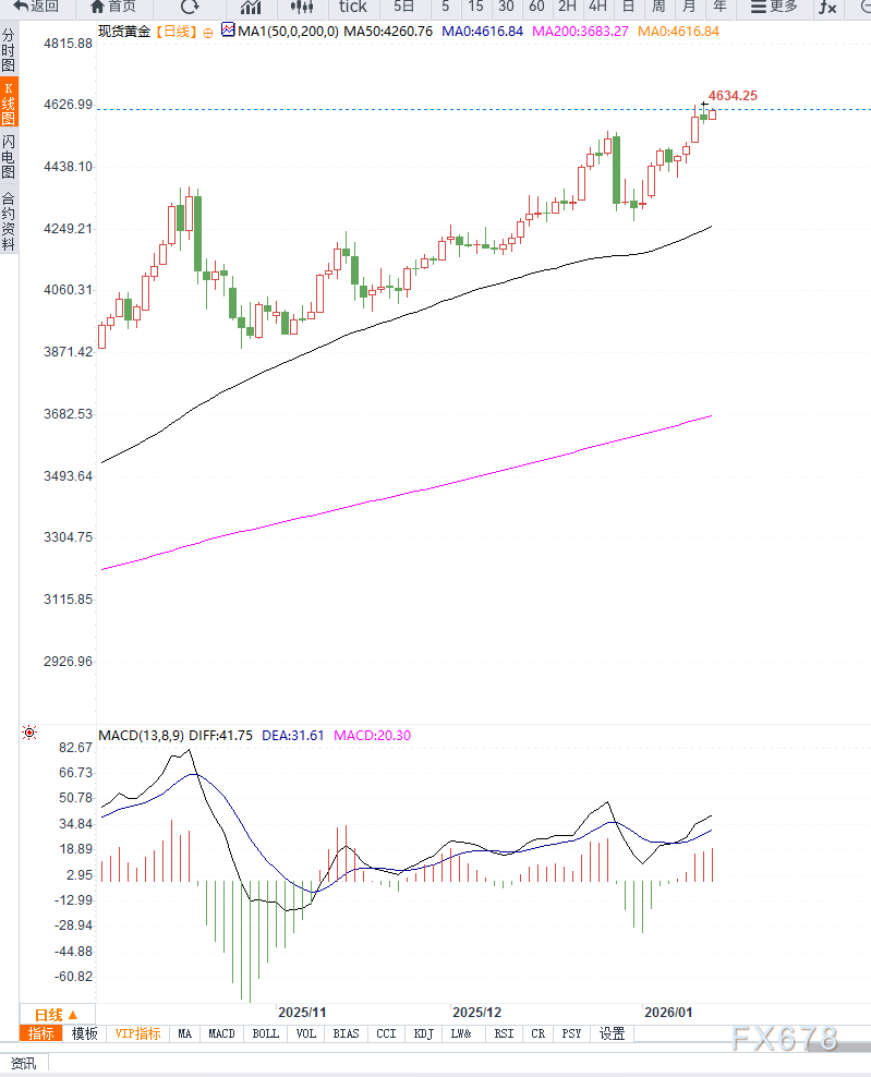 关键价位上,4600美元附近已成为短线重要心理关口,若有效站稳,上方或进一步测试前期高点区域;下方支撑则关注4520—4500美元区间,该区域同时接近短期均线密集带,一旦失守,金价可能转入高位震荡或技术性回调。