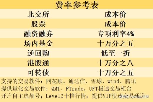 目前市场上个人投资者是可以开通量化交易的,但是需要投资者对于编程和股票操作方面有一定的了解,一般券商都是可以提供量化交易软件的,投资者如果有量化交易需求,可以先联系券商的客户经理来进行操作,目前市场上热门的股票量化交易的软件有:迅投QMT和恒生Ptrade,这两款是受到众多投资者认可的软件,稳定性比较高,收到众多投资者的喜好,并且据我所知市场上极个别的券商是可以做到股票开户10万资金即可免费提供QMT和Ptrade,是目前市场上的较低要求,具体的费率表附在文末,欢迎点击我的头像详询即可办理