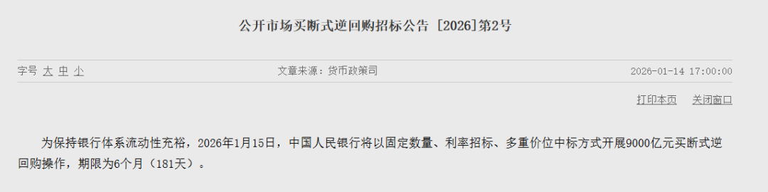 中国人民银行1月14日消息,为保持银行体系流动性充裕,1月15日,中国人民银行将以固定数量、利率招标、多重价位中标方式开展9000亿元买断式逆回购操作,期限为6个月(181天)。