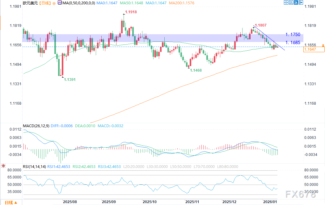技术面来看,从日线图分析,欧元兑美元正试图重返1.1685-1.1750的中性区间。若能成功站稳该区间,将为汇率上探1.1800这一关键心理阻力位铺平道路,同时也意味着汇率存在转向看涨的可能性。当前,14日相对强弱指数(RSI)徘徊在42附近,已逐步向50中性线靠拢;指数平滑异同移动平均线(MACD)双线也开始拐头向上,静待新的强劲利好动能出现。