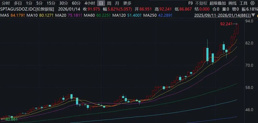 1月14日晚间,国际黄金、白银大涨。截至发稿,现货黄金涨超1%;现货白银盘中站上92美元/盎司,续创新高,日内上涨近6%;2026年以来累涨超28%。消息面上,美联储卡什卡利表示,不认为“1月有降息动力”,本月应维持利率不变。
