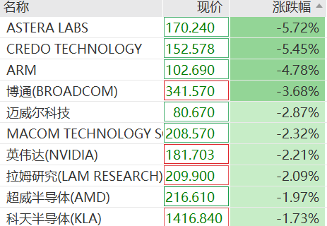 科技股多数下跌,芯片股跌幅居前,ARM跌近5%,迈威尔科技、超威半导体、英伟达均跌约2%,美股科技七巨头系数下跌。