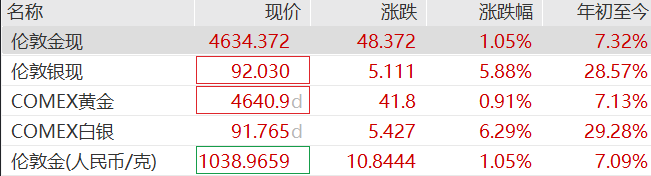 贵金属方面,白银持续狂飙。现货白银突破92美元/盎司,续创历史新高,年内已累计涨28.6%。现货黄金一度4640美元/盎司,目前涨超1%。